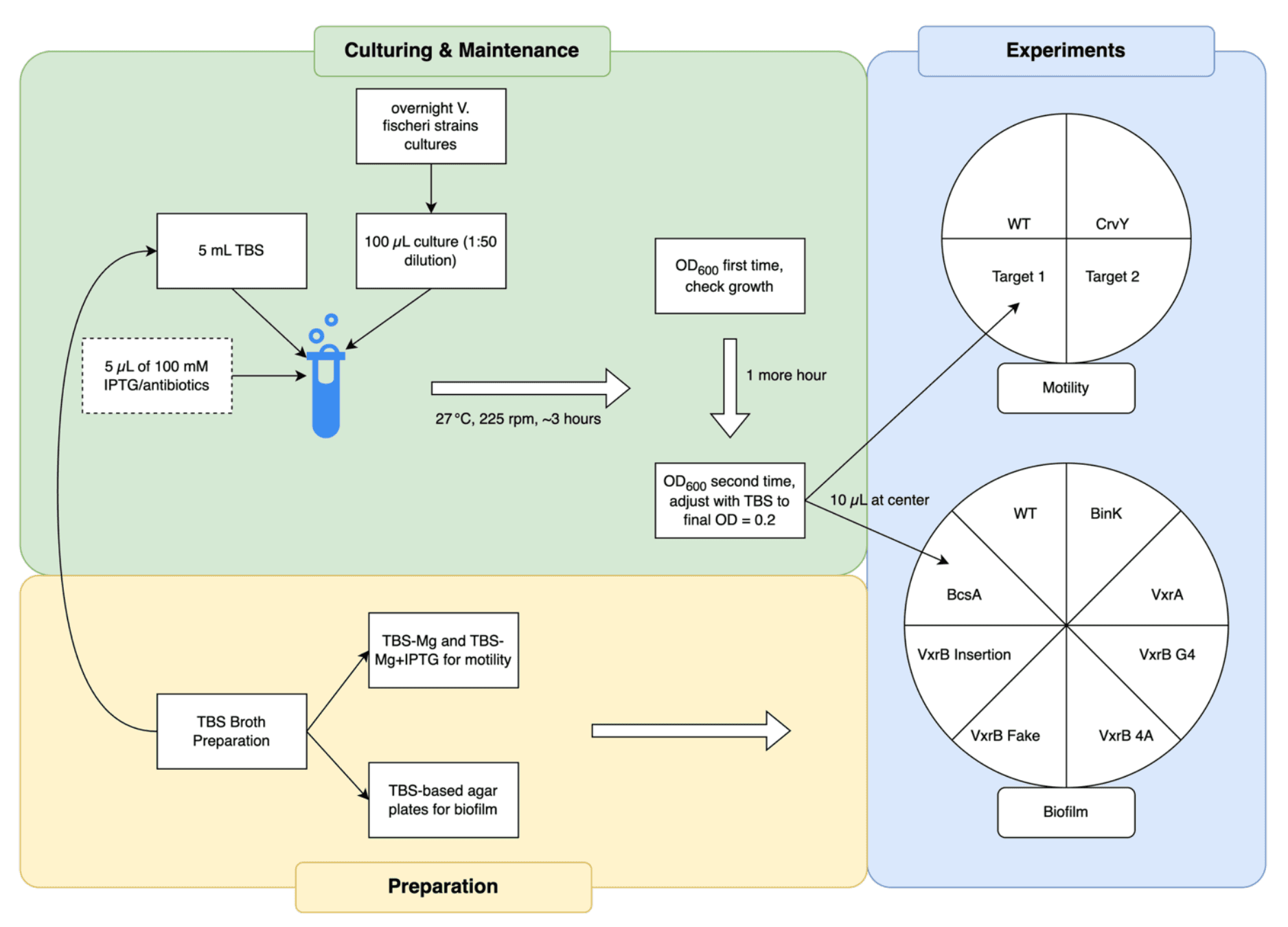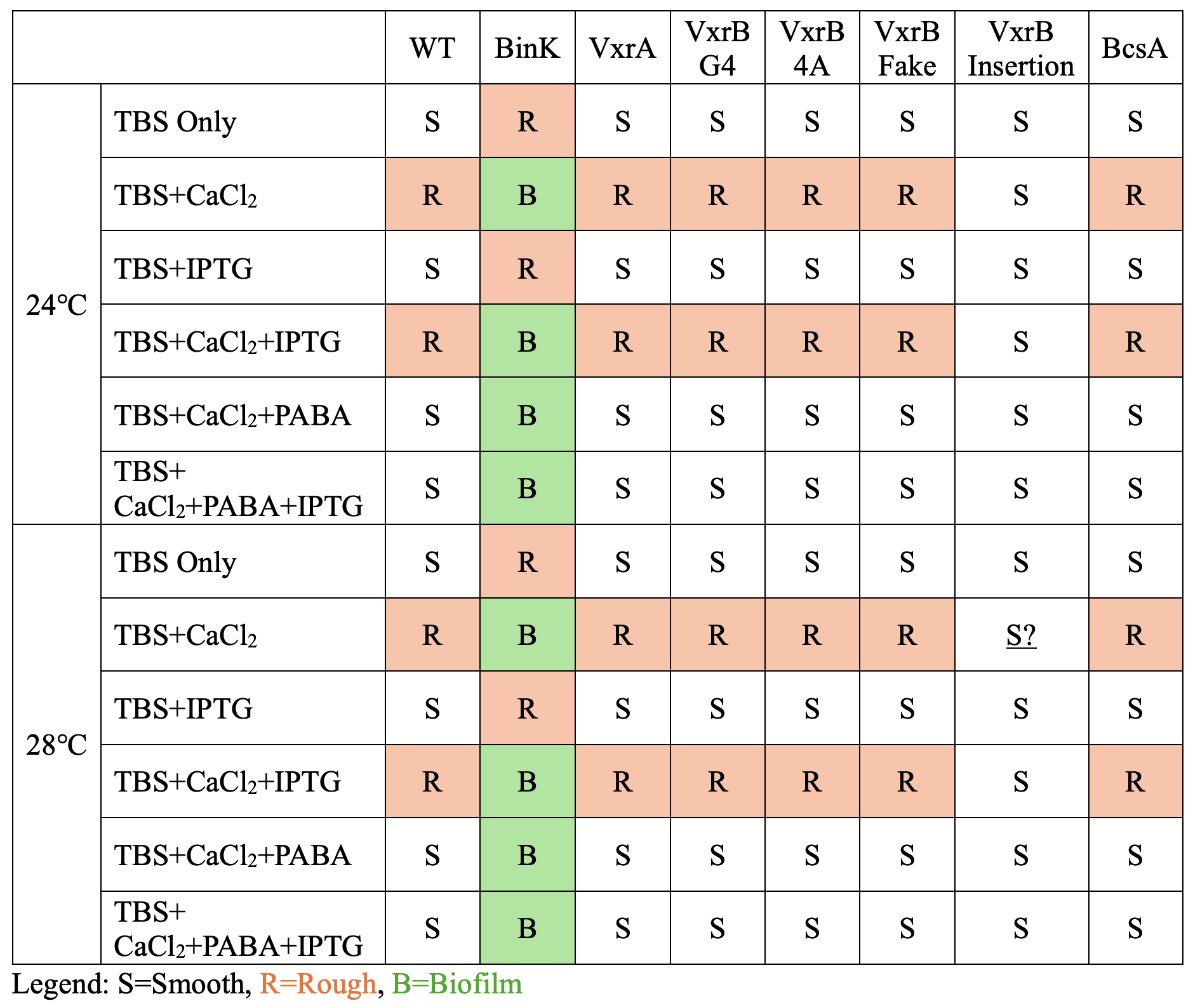 - We wanted to see how genes (like VxrA, VxrB, CrvY, BinK…) and environmental conditions (like calcium, PABA, antibiotics, temperature) affect those behaviors.