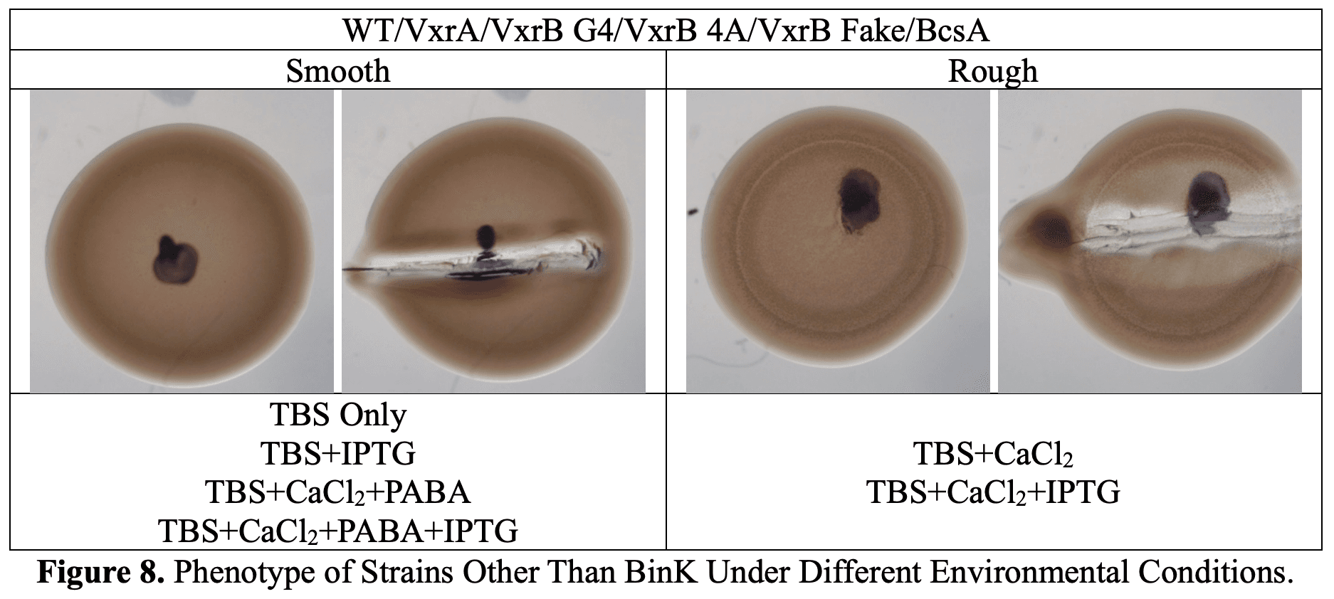 | Condition | BinK mutant | Other strains (WT, VxrA, VxrB variants, BcsA) |